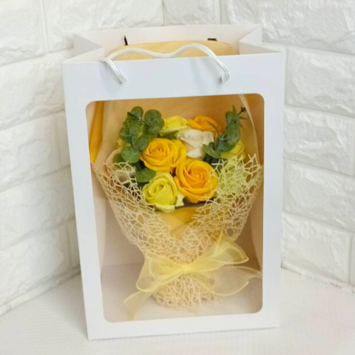 ソープフラワーのイエローバラを2〜3種に、グリーンを組み合わせてブーケにしました。