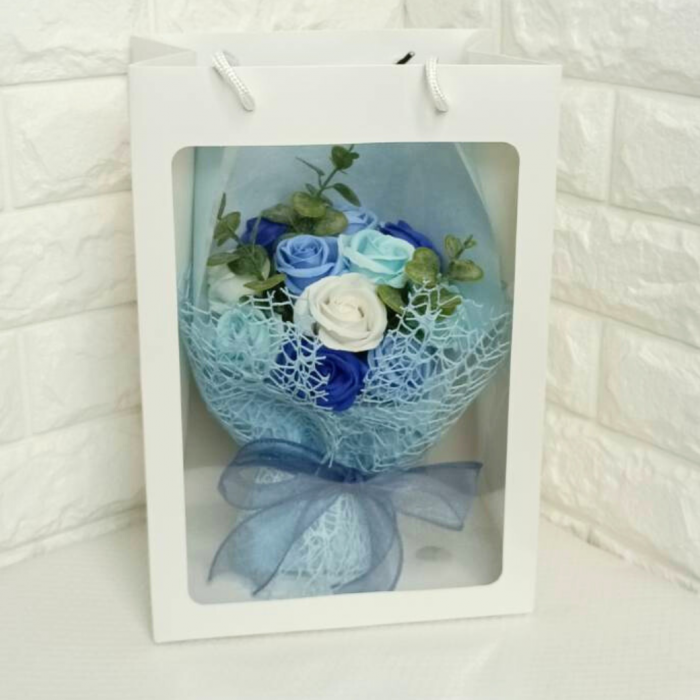 ソープフラワーのブルーバラを2〜3種に、グリーンを組み合わせてブーケにしました。