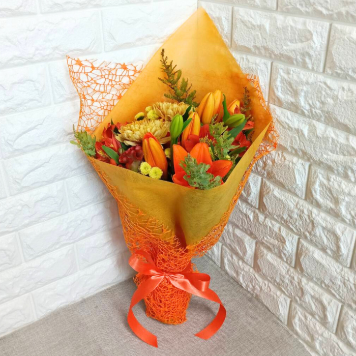 当店のフラワーデザイナーが旬の花を厳選し、季節に合わせたイエロー・オレンジの花束を仕上げます。
